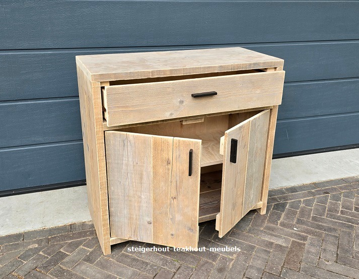 Steigerhouten ladenkast bureau. Handige ladenkast voor bij je bureau. In de slaapkamer of zelfs op de badkamer. Standaard met houten handgrepen, diverse handgrepen mogelijk, met leren lusjes, steigerbuis of metalen handgreep zwart zie foto,s. Standaard met 3 laden. Ook mogelijk met wieltjes. Zo is de ladenkast makkelijk te verplaatsen.