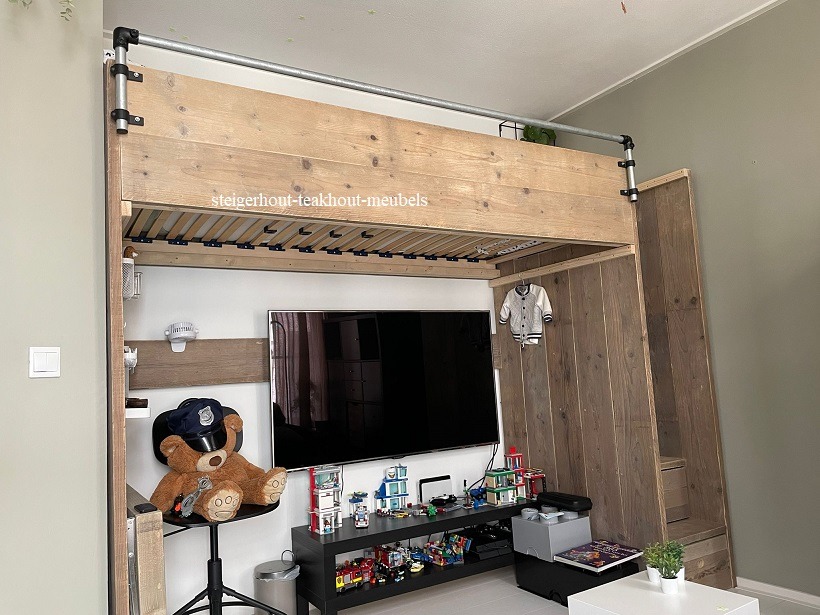 Stapelbed steigerhout. Met een stevige veilige trap. In de trap kunnen we ook lades maken. Zo heb je lekker veel opbergruimte. Ook onder het bed kunnen we lades maken. Zo heb je altijd een opgeruimde kamer. Plek voor 2 personen om te slapen. Ideaal voor een kleine kamer of voor een vakantiehuis.
