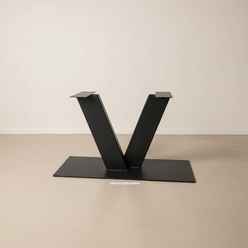 Metalen V poot. Een stoer onderstel waar je veel beenruimte hebt.
