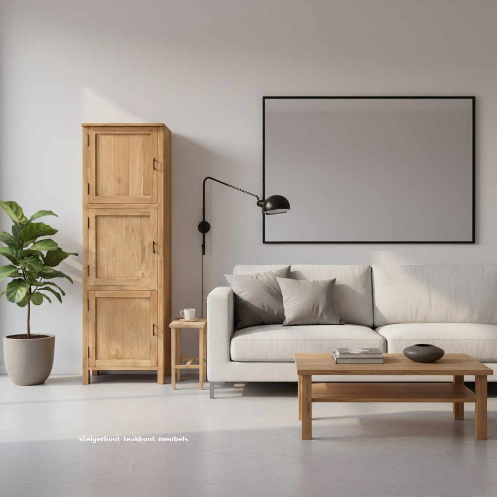 Teakhout boekenkast smal model. Met 3 dichte deuren daarachter een legplank en een handgreep.