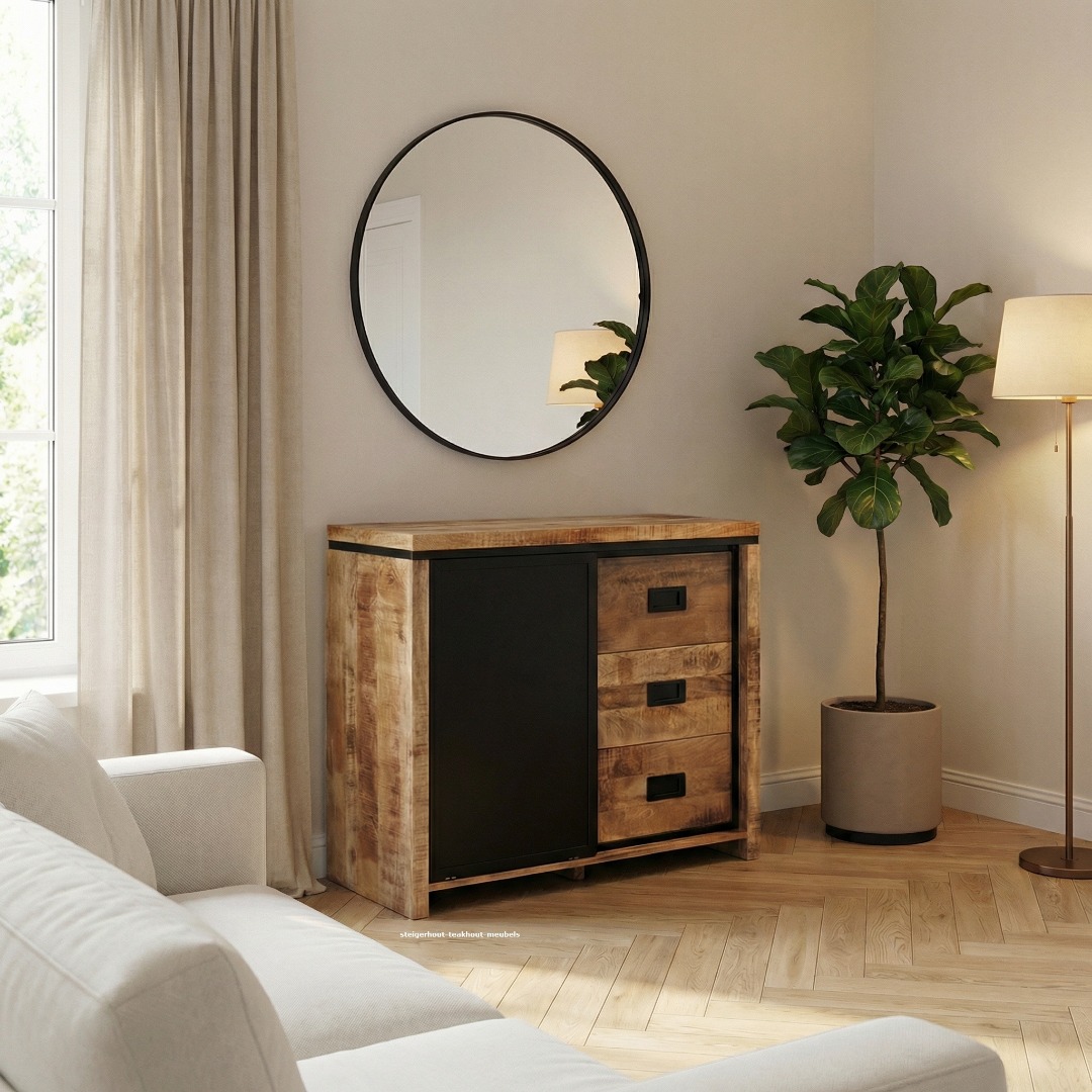 In dit dressoir genoeg opbergruimte achter de stalen schuifdeur met in het midden een legplank. En de 3 ruime lades met een zwart metalen handgreep.