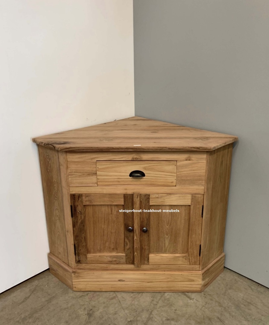 Teakhout tv-hoekkast met 2 deuren en boven een lade. 95 cm breed achterkant van hoek tot hoek, 65 diep en 75 cm hoog. De zijde langs de muur zijn 55 cm. Achter de deuren een open ruimte zonder legplank.