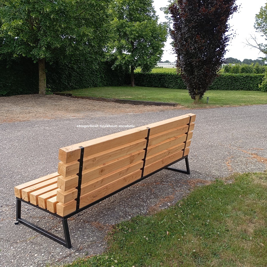 Gemaakt van ongeveer 9 a 10 cm dikke douglashout balken. Goed gedroogd en geschaafd. Als onderstel een modern metalen frame doorsnede 6 cm wat iets tabs toeloopt. Netjes gelast en afgewerkt met een zwarte poedercoating. Het metalen frame loopt door onder de zitting voor extra stevigheid. En bij de rug is het frame ingefreesd in de rugleuning zie foto 2.