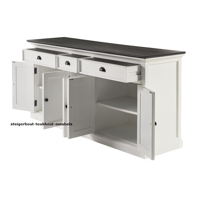 Dressoir wit gemaakt van mahoniehout. 180 x 50 x 85 hoog, met 3 laden, en 4 deurtjes. Het bovenblad van mahoniehout is zwart geverfd.